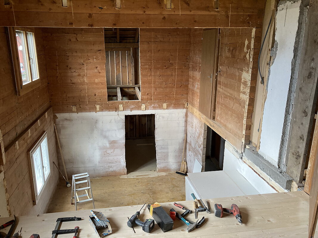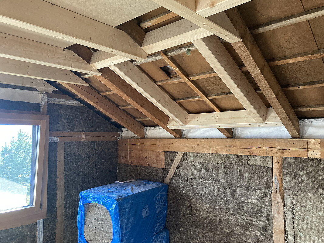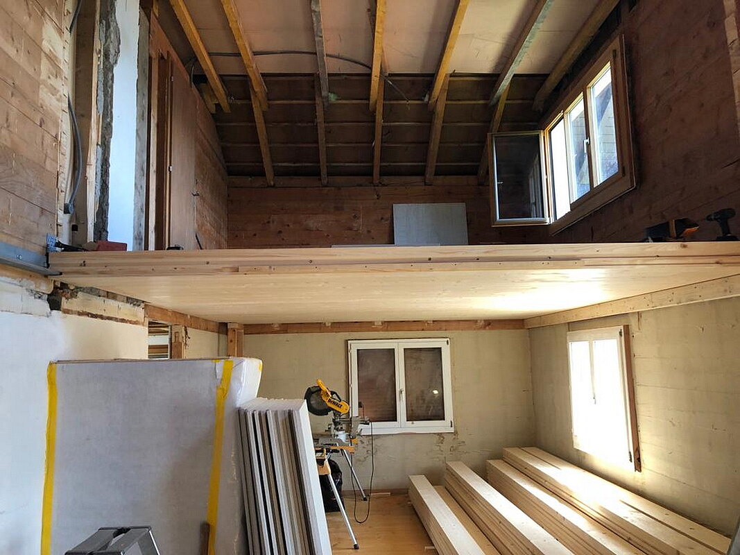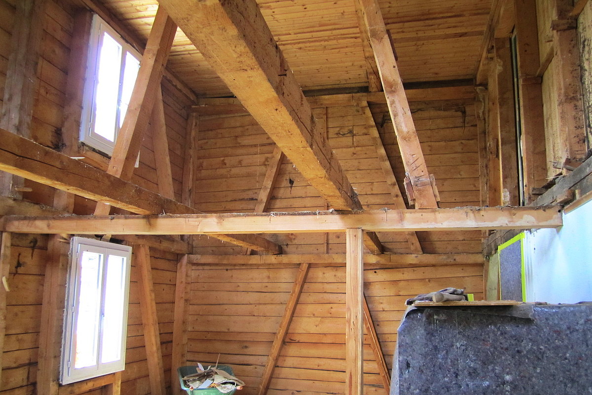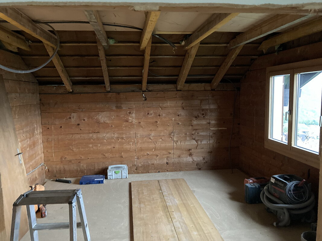 - kompletter Innenausbau, Wände, Decke, Fenster, Dachfenster, Türen, Parkett